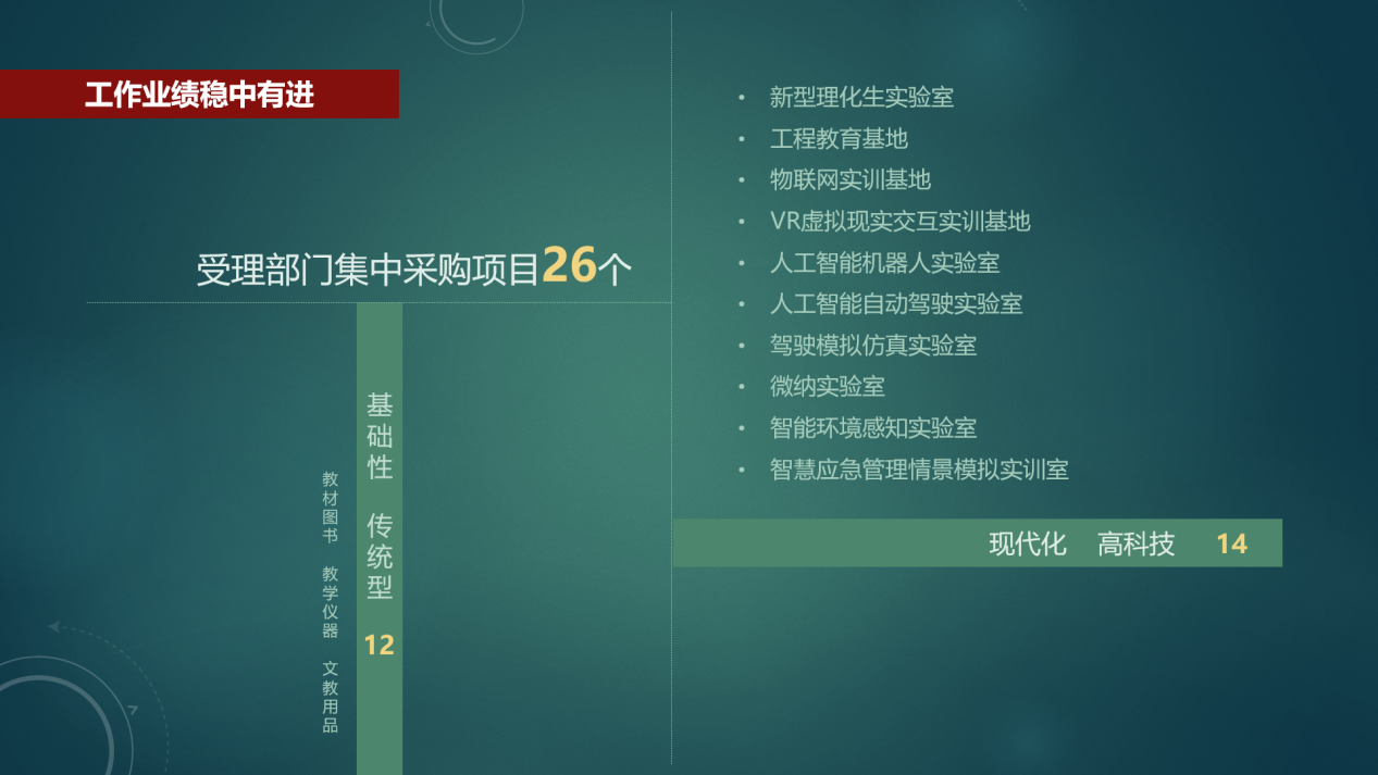 其中,完成局零星采购项目161个,项目数创历史新高;完成部门集中采购项目26个,预算金额约4605万元,实际成交金额约4141万元,节约财政资金约464万元,资金节约率10.08%,项目内容涵盖传统图书教材、教学设备和人工智能、物联网、虚拟现实、模拟仿真等新型实验室、实训基地建设,体现了采购工作的科学性和前瞻性;配合招标代理机构实施分散采购项目(含非财政性资金采购项目)137个,做好文件审核、场地服务、评标监管、档案备份等工作,重点对学校食堂服务外包、学生校服采购等上级部门或家长较为关注的项目进行指导和把关。