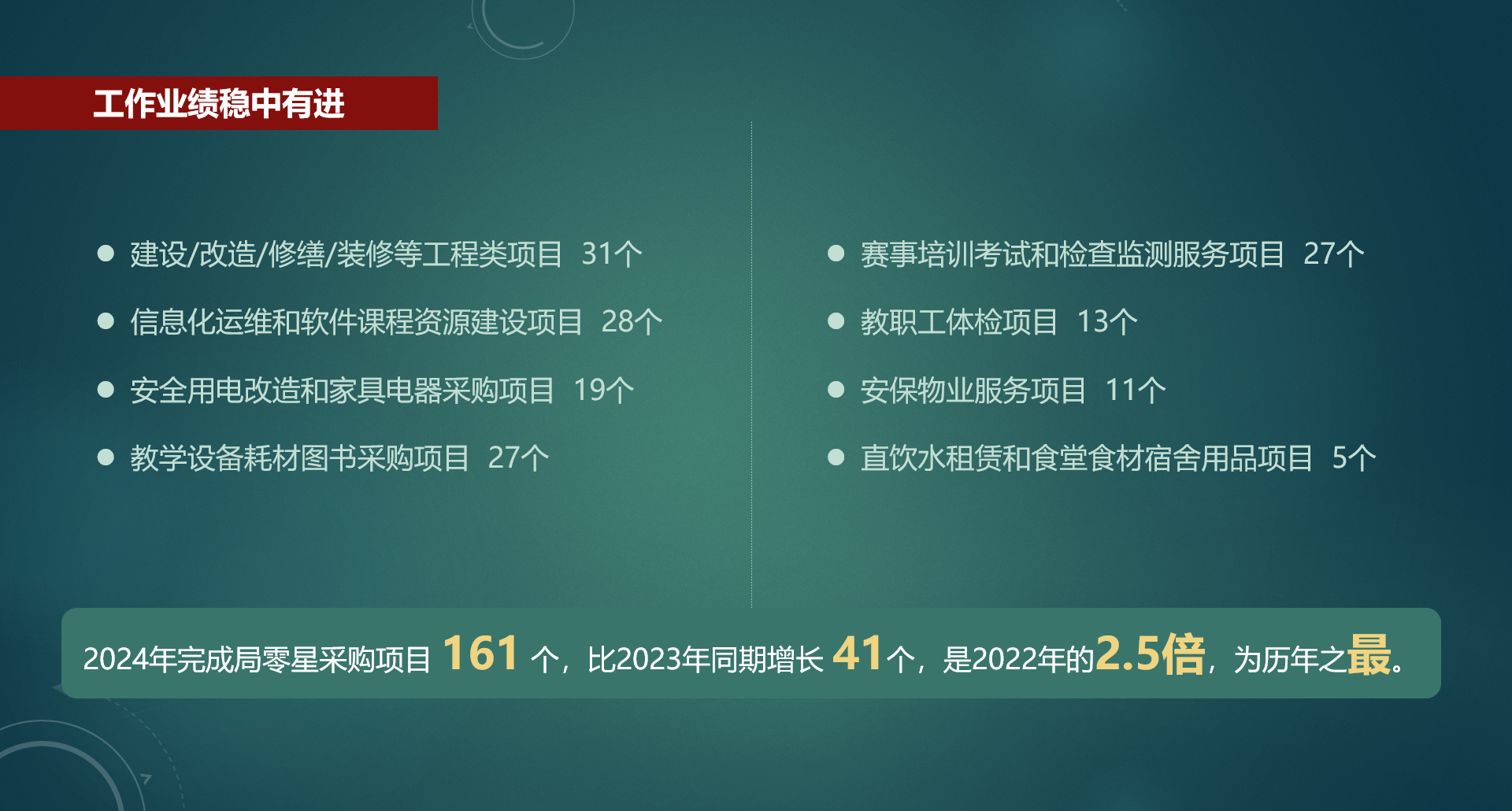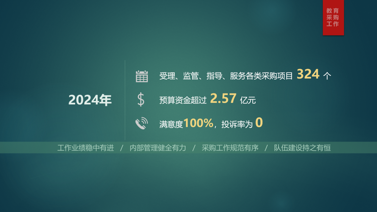 2024年,市教育局部门集中采购机构总计受理、监管、指导、服务各类采购项目324个,预算资金超过2.57亿元,满意度100%,投诉率为0。工作业绩稳中有进、内部管理健全有力、采购工作规范有序、队伍建设持之有恒,为直属院校和事业单位规范顺利实施各类采购工作提供了有效支撑。