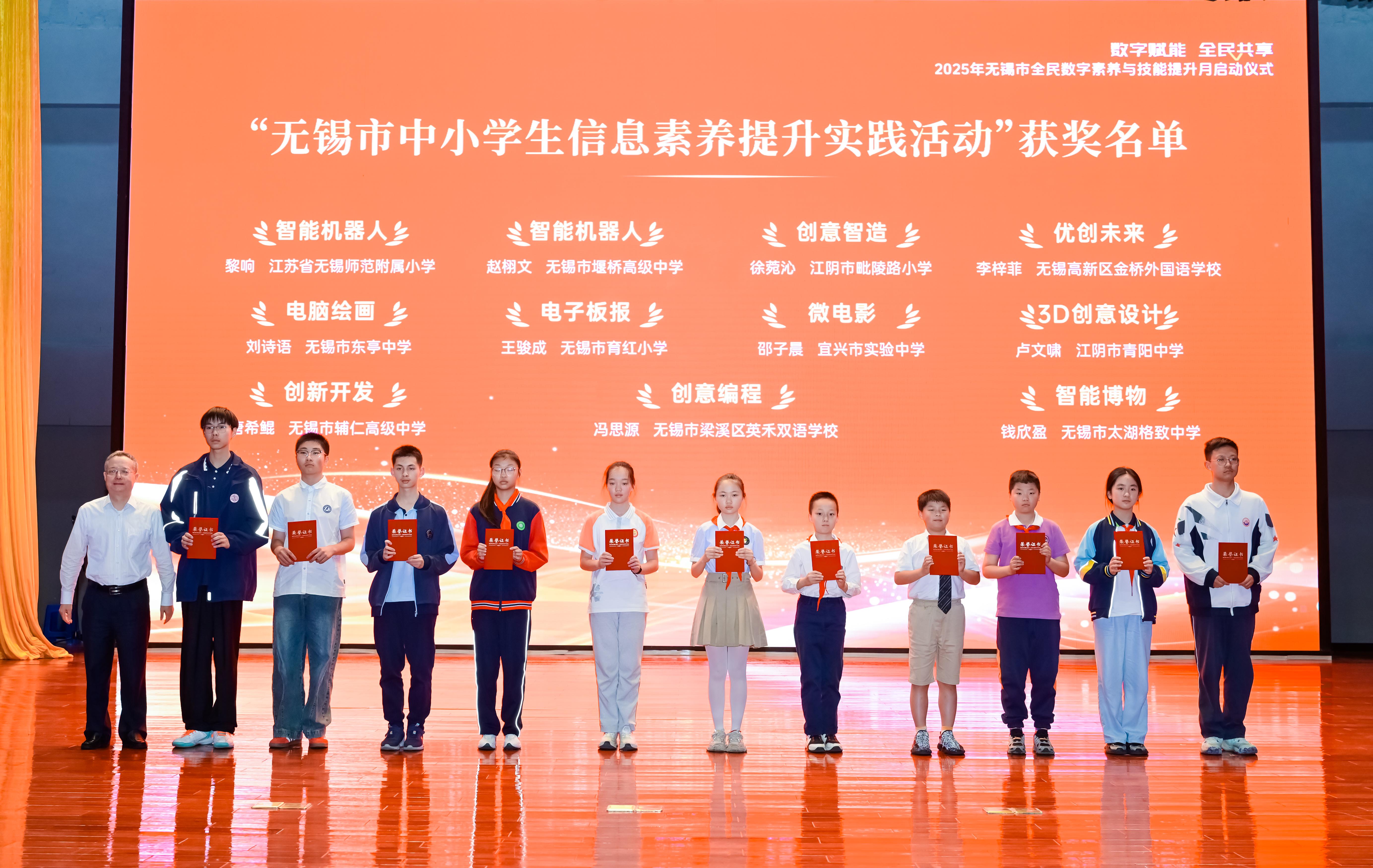 5月26日下午,在无锡市委网信办联合12家单位共同主办的2025年无锡市全民数字素养与技能提升月在启动仪式上,由无锡市教育局主办、无锡市教育信息化和装备管理服务中心承办的2025年无锡市中小学生信息素养提升实践活动颁奖仪式隆重举行,市教育局陈曦副局长为我市各区县和直属学校的11名学生代表颁发荣誉证书。