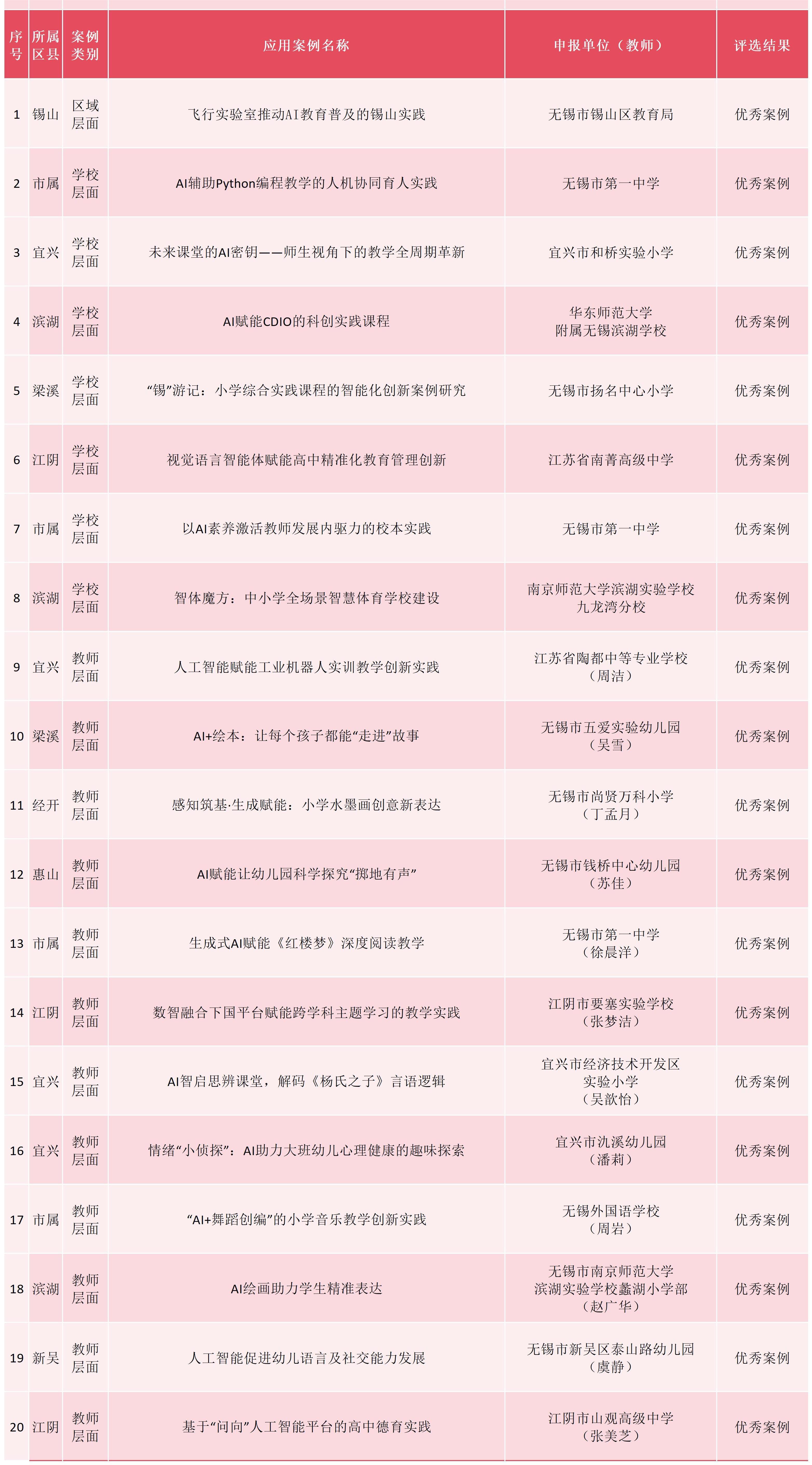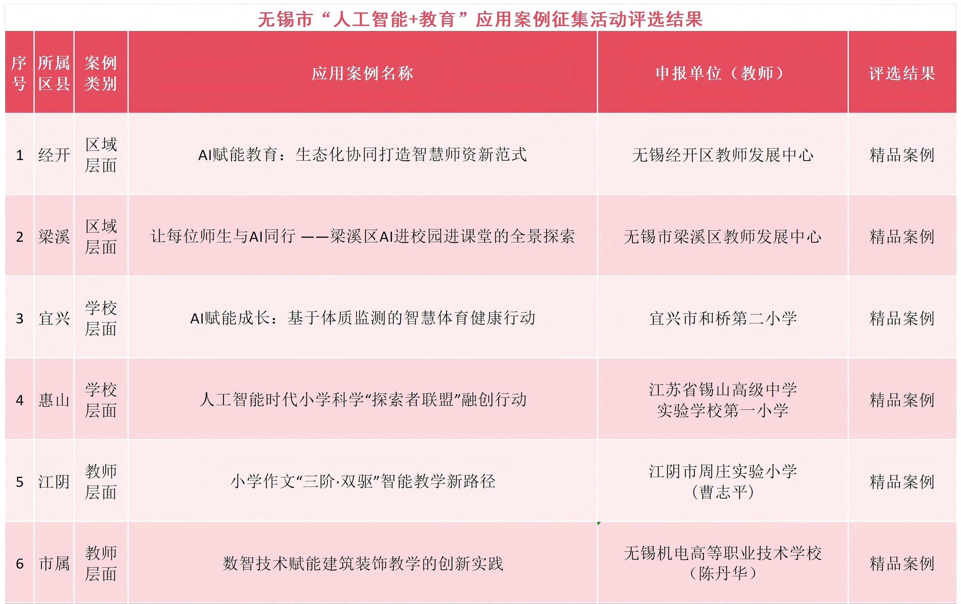 近日,无锡市教育局组织开展的“人工智能+教育”应用案例征集活动落下帷幕,评选结果正式公布。此次活动共吸引了全市各地、各校踊跃参与,共征集到 95 个创新应用案例。经过严格、专业的评审,最终评选出 6 个精品应用案例和 20 个优秀应用案例,充分展现了无锡市在人工智能与教育深度融合领域的创新实践与丰硕成果。
