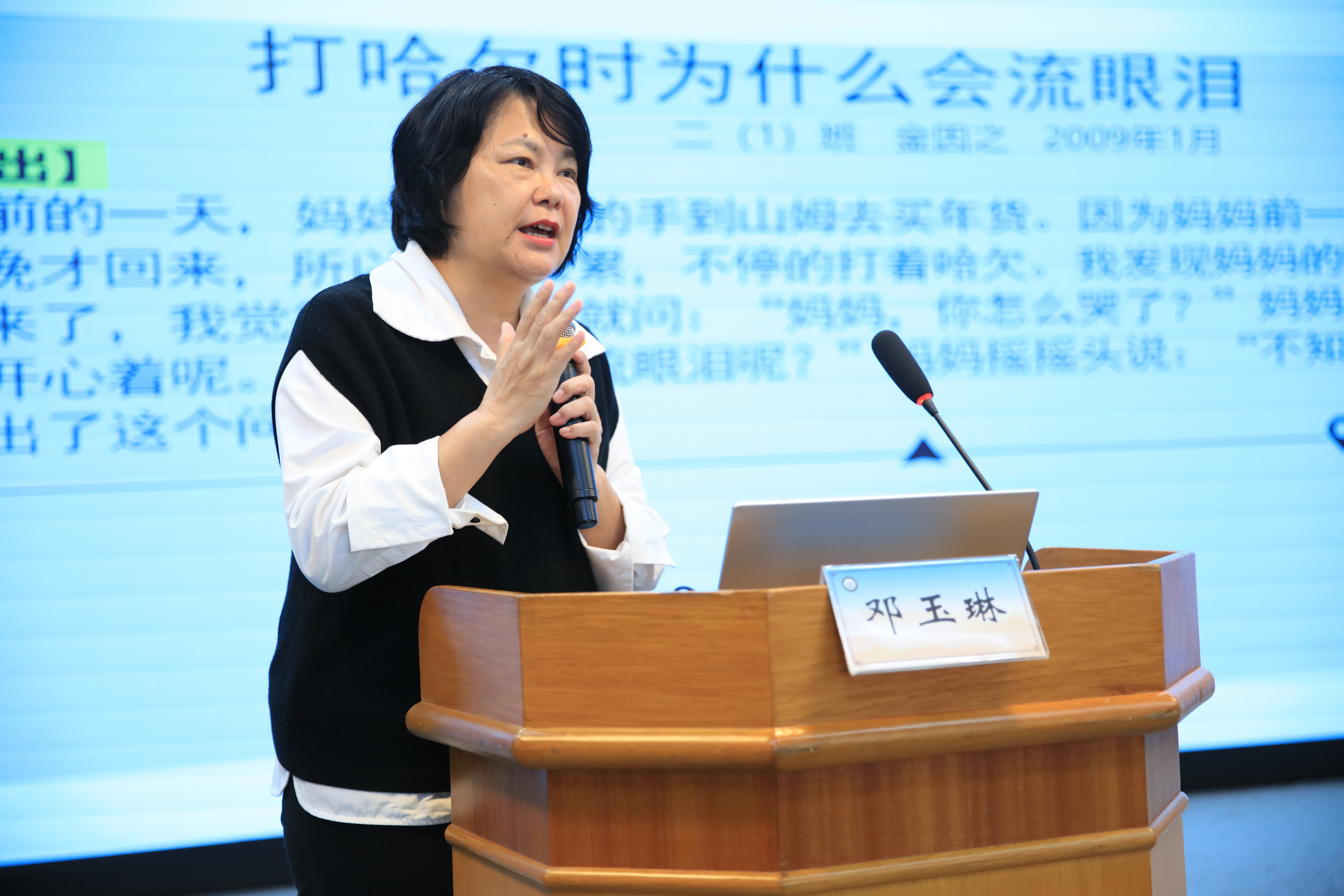 深圳市南山实验教育集团南头小学邓玉琳老师分享《当人工智能遇上笔尖探索》,展示AI在小学生研究性写作中的实践成果。
