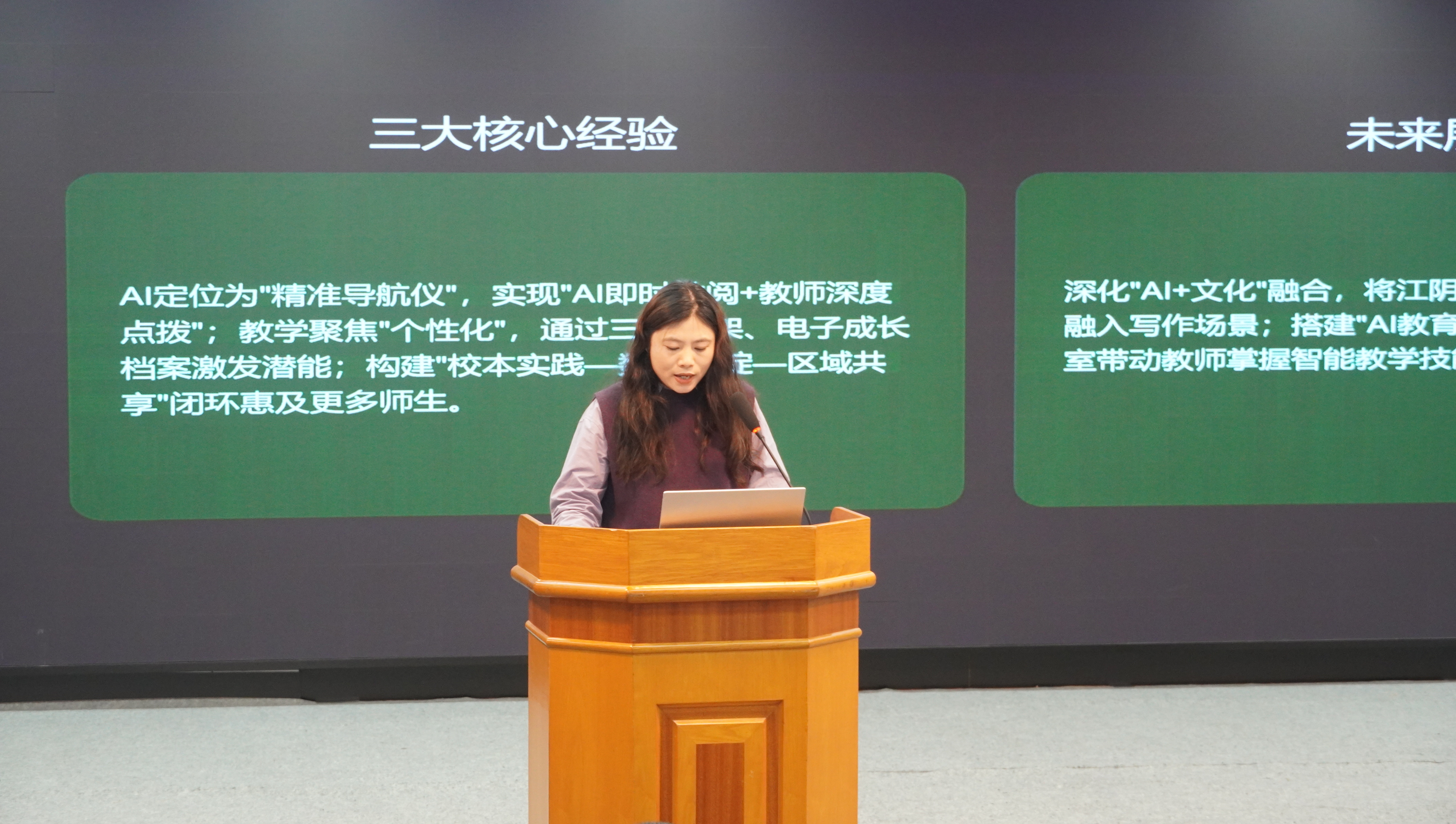 江阴市周庄实验小学教育集团总校长钱丽霞介绍了学校在智慧校园建设方面的实践成果。作为首批江苏省智慧校园示范校,学校搭建了“好专业作文评价系统+作文智能学伴系统”应用体系,实现中高年级103个班级AI作文教学应用全覆盖,为本次研训提供了扎实的实践样本。