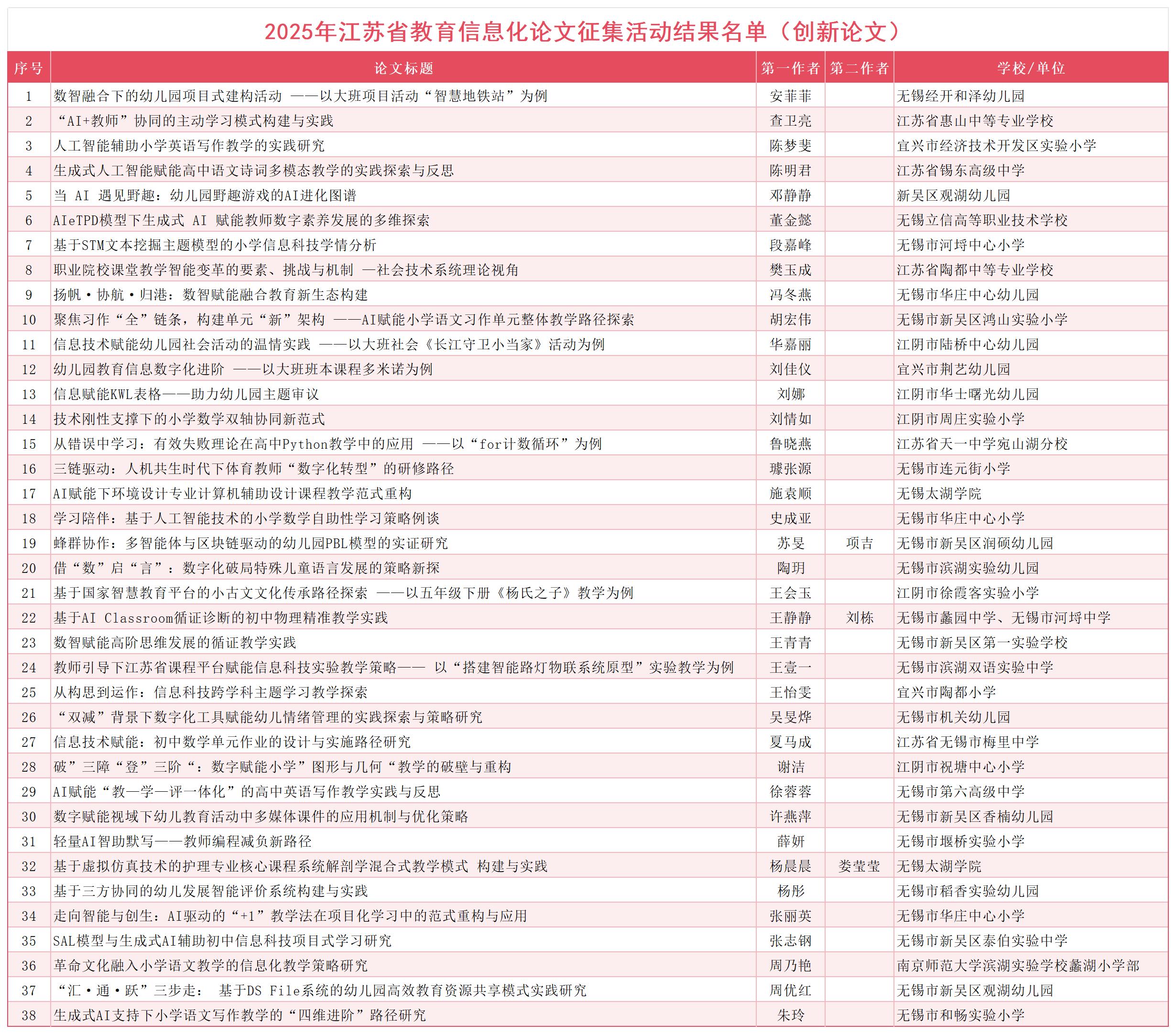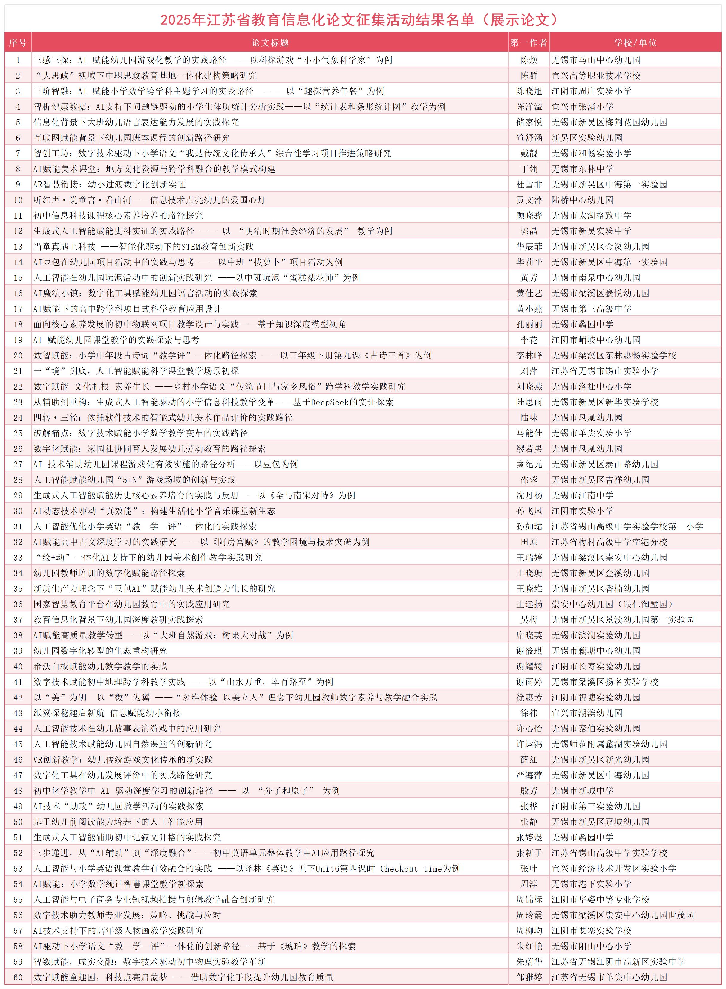 2025年12月,江苏省教育信息化与数据管理中心公示了2025年江苏省教育信息化论文征集活动结果,无锡市组织专家经严格评审,共推选150篇优秀论文报送参与省级遴选,最终149篇论文成功入选省级获奖名单,获奖比例高达99.3%!其中,创新论文38篇、特色论文51篇、展示论文60篇,充分展示了我市在教育信息化领域的深厚积淀与创新活力。