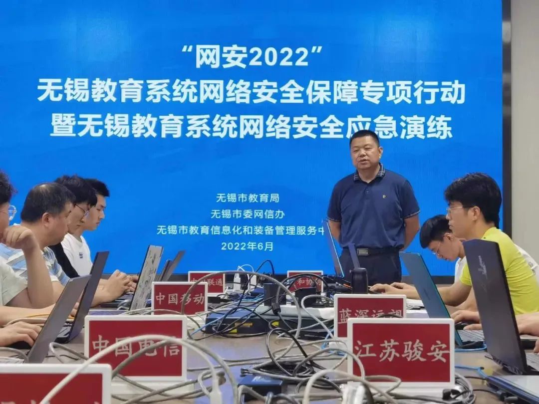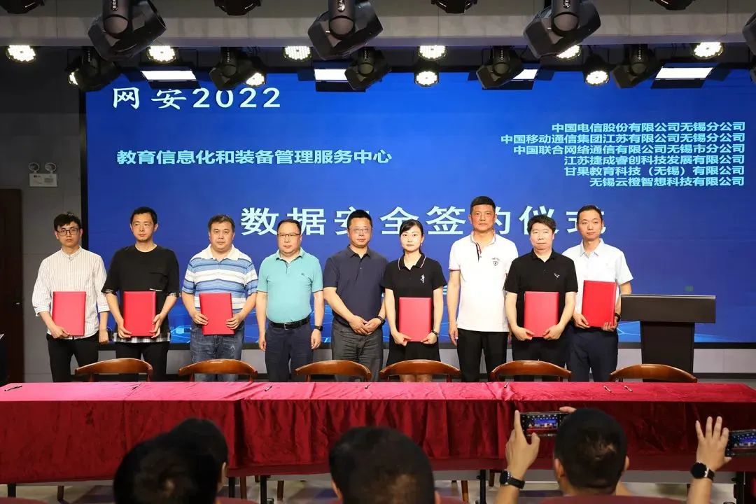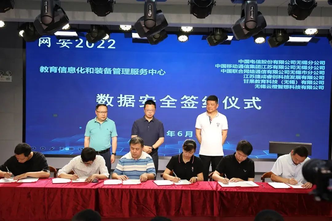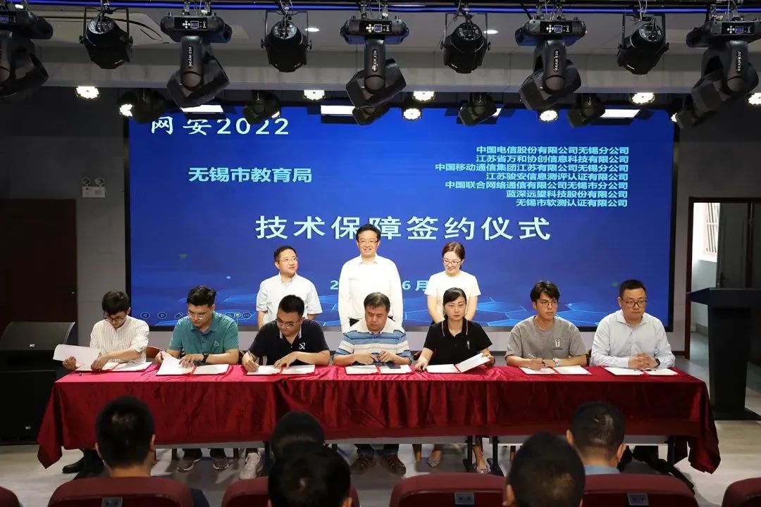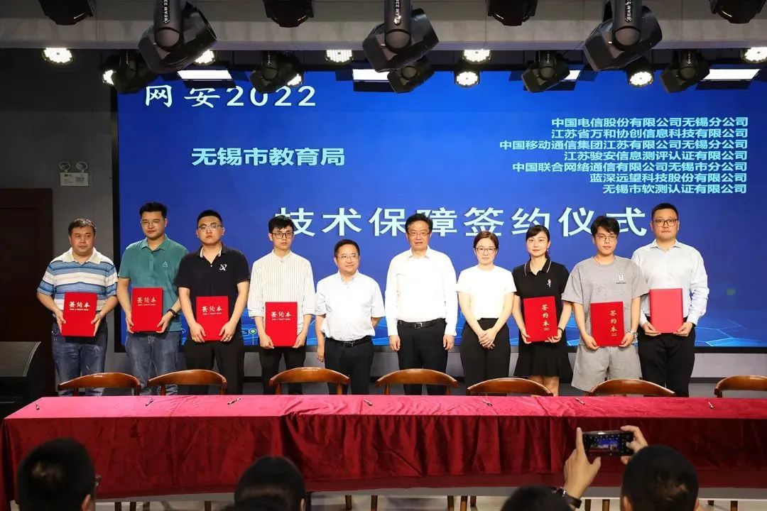 2022年6月23日,“2022网安”无锡教育系统网络安全保障专项行动正式启动。启动仪式上,无锡市教育局、无锡市教信装备中心分别与中国电信无锡分公司、中国移动无锡分公司、中国联合网络通信无锡市分公司、江苏省万和协创信息科技有限公司、江苏骏安信息测评认证有限公司、蓝深远望科技股份有限公司、无锡市软测认证有限公司等多家单位签署数据安全及技术保障战略协议,强强联合,进一步提高全市教育系统网络安全防护水平,化解网络安全风险,共筑网络安全长城,以实际行动迎接党的二十大胜利召开。