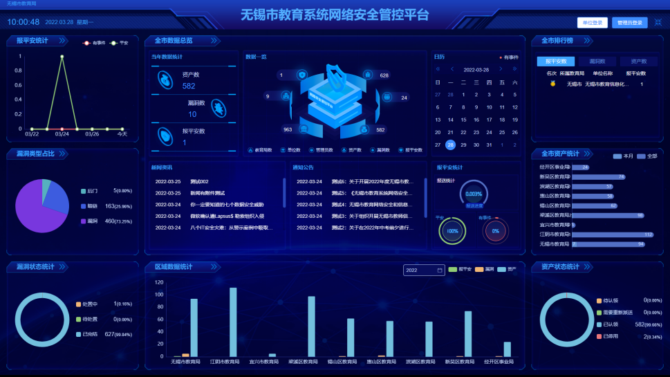 教育系统网络安全管控平台建设至今,已入驻包括市区级教育局、事业单位、各类学校在内的1000余家单位,教育相关单位入驻率达99%。平台上线运行以来,共计通报漏洞667个,漏洞处置及时率高达100%。2022年截止目前,该平台累计统计资产数据达584条,有效帮助各单位更直观了解本单位信息资产状况、安全态势、安全能力。